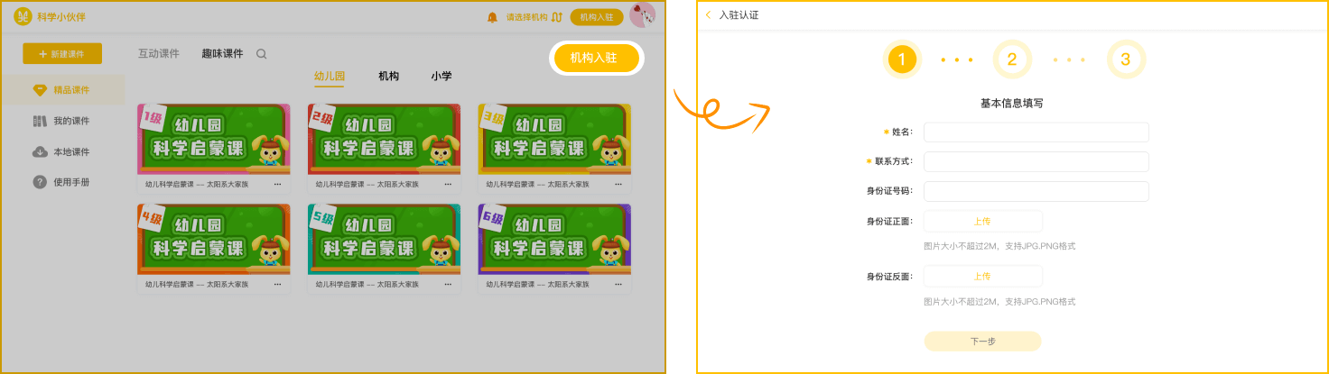 认证成为机构,即可使用平台自有的课件资源,快捷方便实用,不占用空间使用说明:填写机构基本信息,姓名、联系方式、机构名称…标注为“*”的为必填项,提交基本资料后等待后台工作人员审核通过后,机构方可认证成功