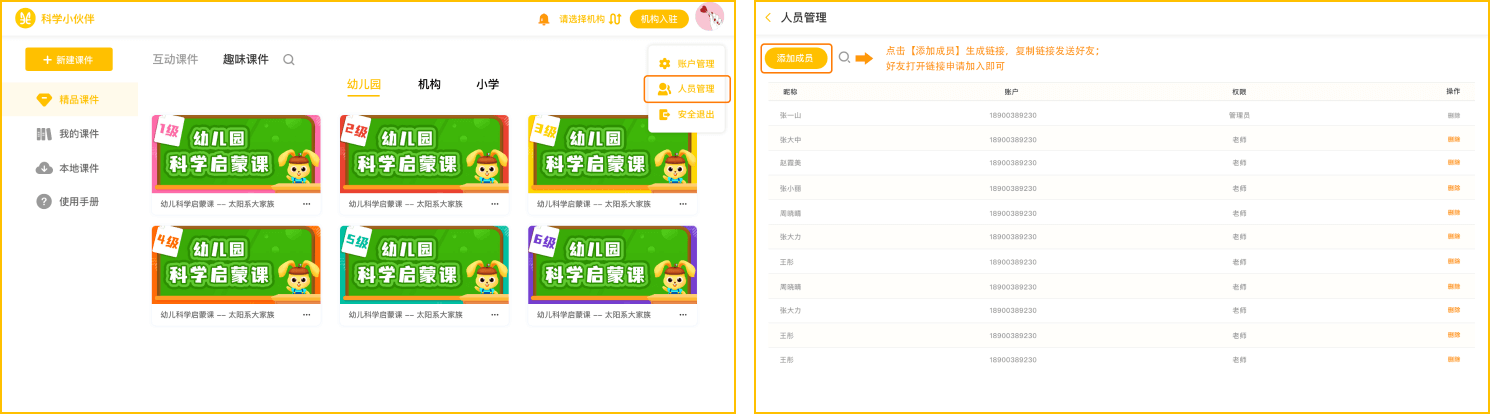认证成为机构后,将分配专属课程,园长(管理员)可以主动邀请老师(团队成员)加入机构,使用平台中的课件资源;园长(管理员)有权限对加入机构的老师(团队成员)进行管理调整