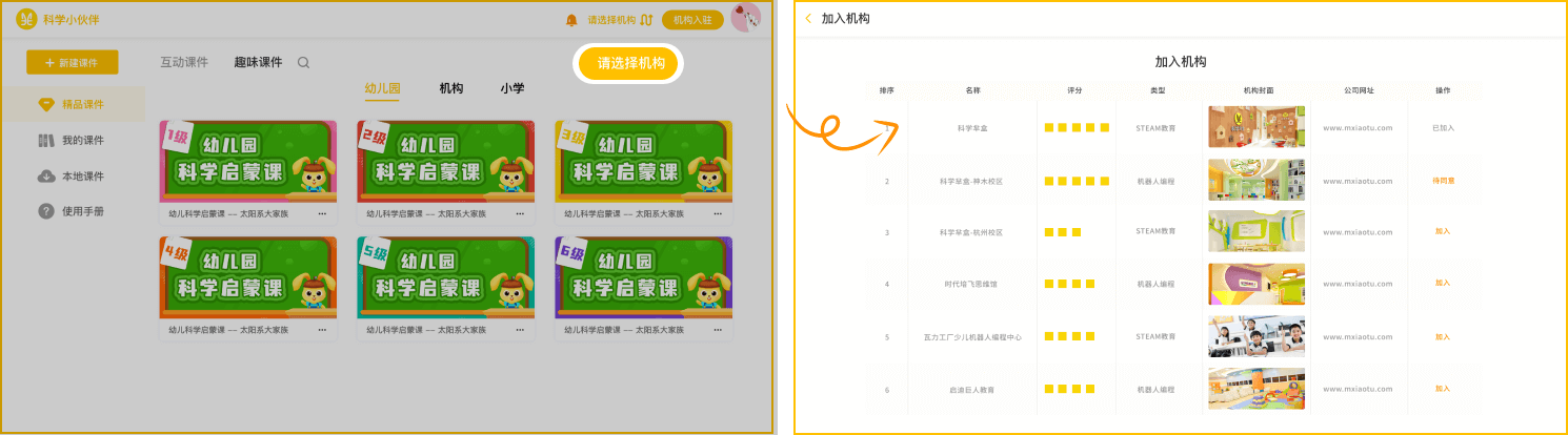 老师加入机构的方式有两种,老师主动加入机构,园长(管理员)邀请老师加入机构老师主动加入机构:园长(管理员)审核成功后即可查看课件
