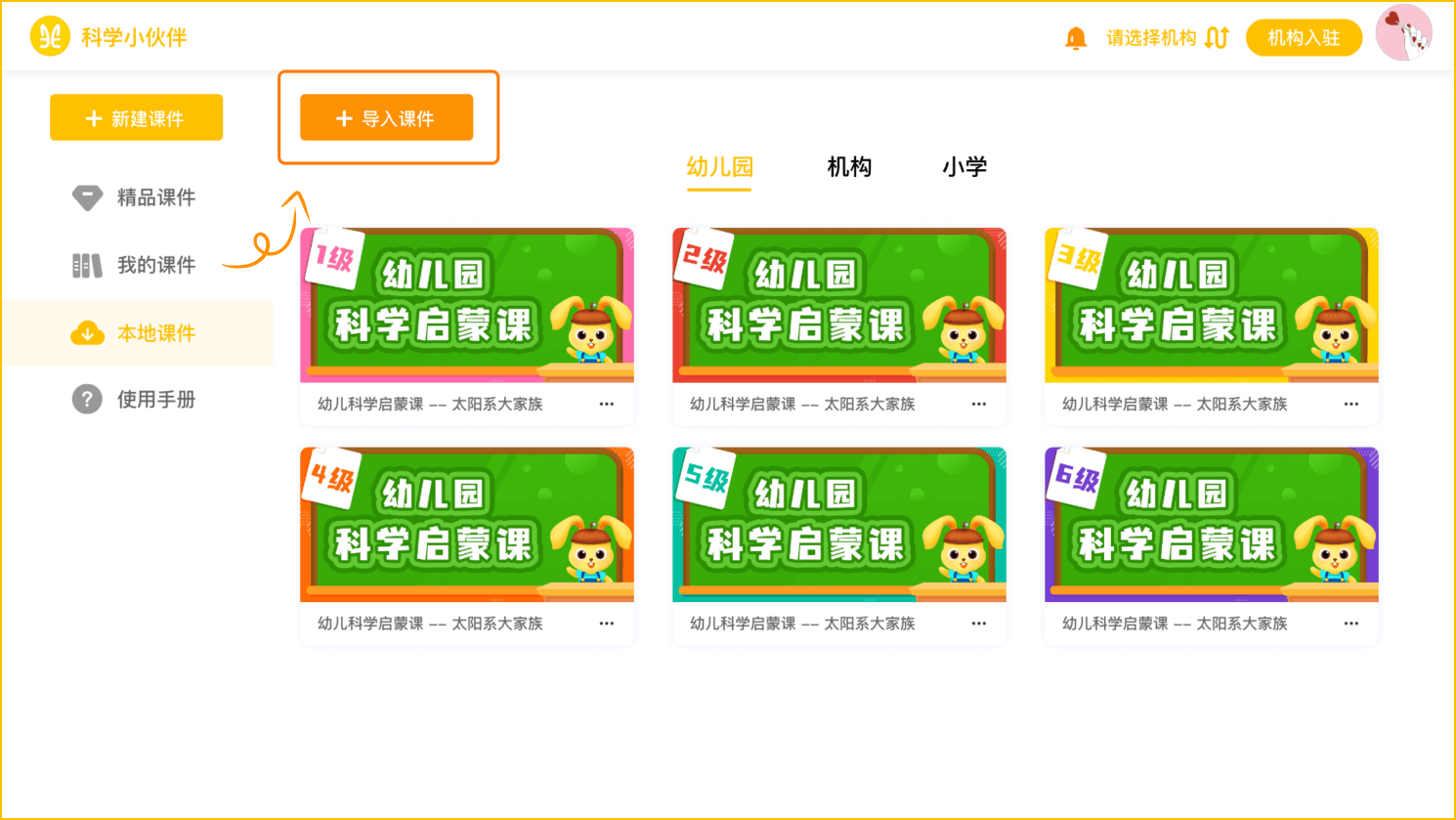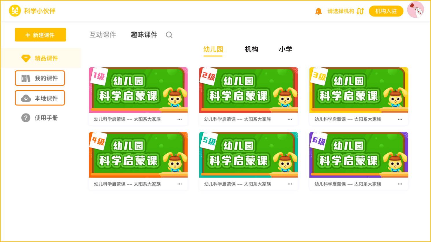 使用说明:教学平台使用者为两种身份,一种为园长(管理者),一种为老师(团队成员);园长可通过【机构入驻】获得管理员的身份,机构入驻成功后,即可使用平台自有的丰富的课件资源,快捷方便;还可以邀请老师(团队成员)一起共享使用,园长(管理员)可以管理加入机构的老师(团队成员);老师也可主动申请加入机构,园长(管理员)审核通过后也可以使用课件资源。【备注:当用户不选择成为任何用户时,用户只能查看使用部分课件】