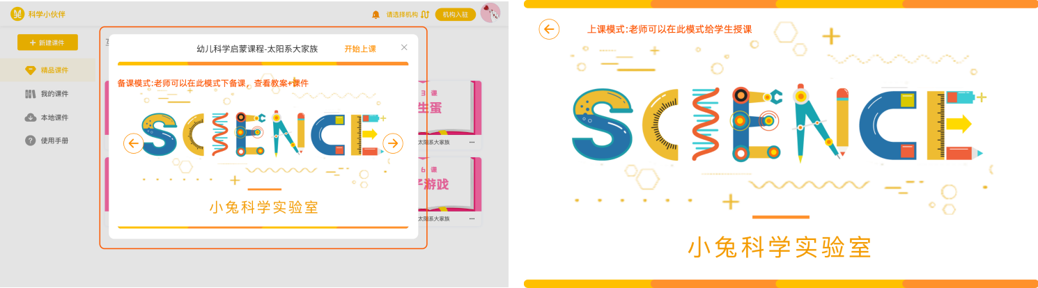 课件分为【备课模式】 、【上课模式】两种模式【备课模式】: 备课教案+课件结合,方便老师备课使用;【上课模式】:上课课件,老师上课时可直接使用课件给学生授课